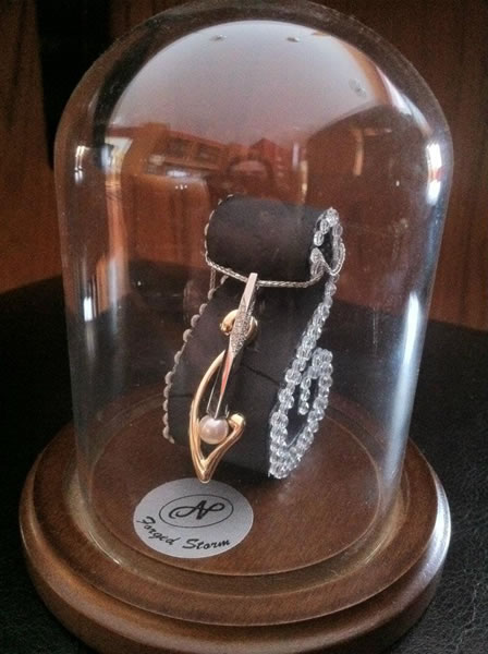 Paying homage to the Banff Soroptimist Club's first president Pearl Riley, this exquisite pendant hangs from a 14-carat white gold, diamond-cut chain, and features a cream-coloured cultured pearl. Incorporating the founding date of the world's first Soroptimist club in 1921 and the Banff club's 21st annual fundraising dinner, the pearl is flanked by an 18-carat yellow gold number two and 18-carat white gold number one encrusted with 18 one point diamonds.